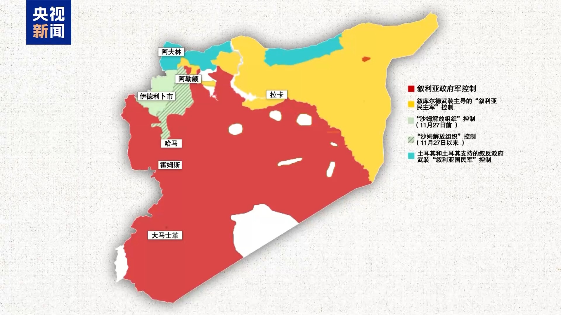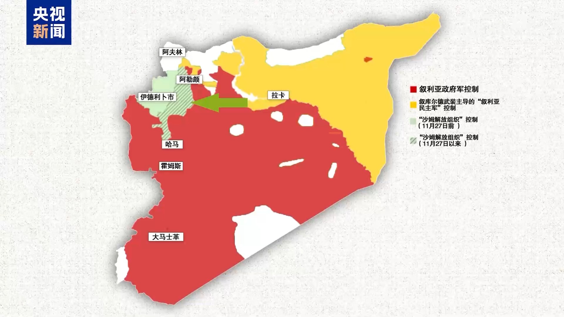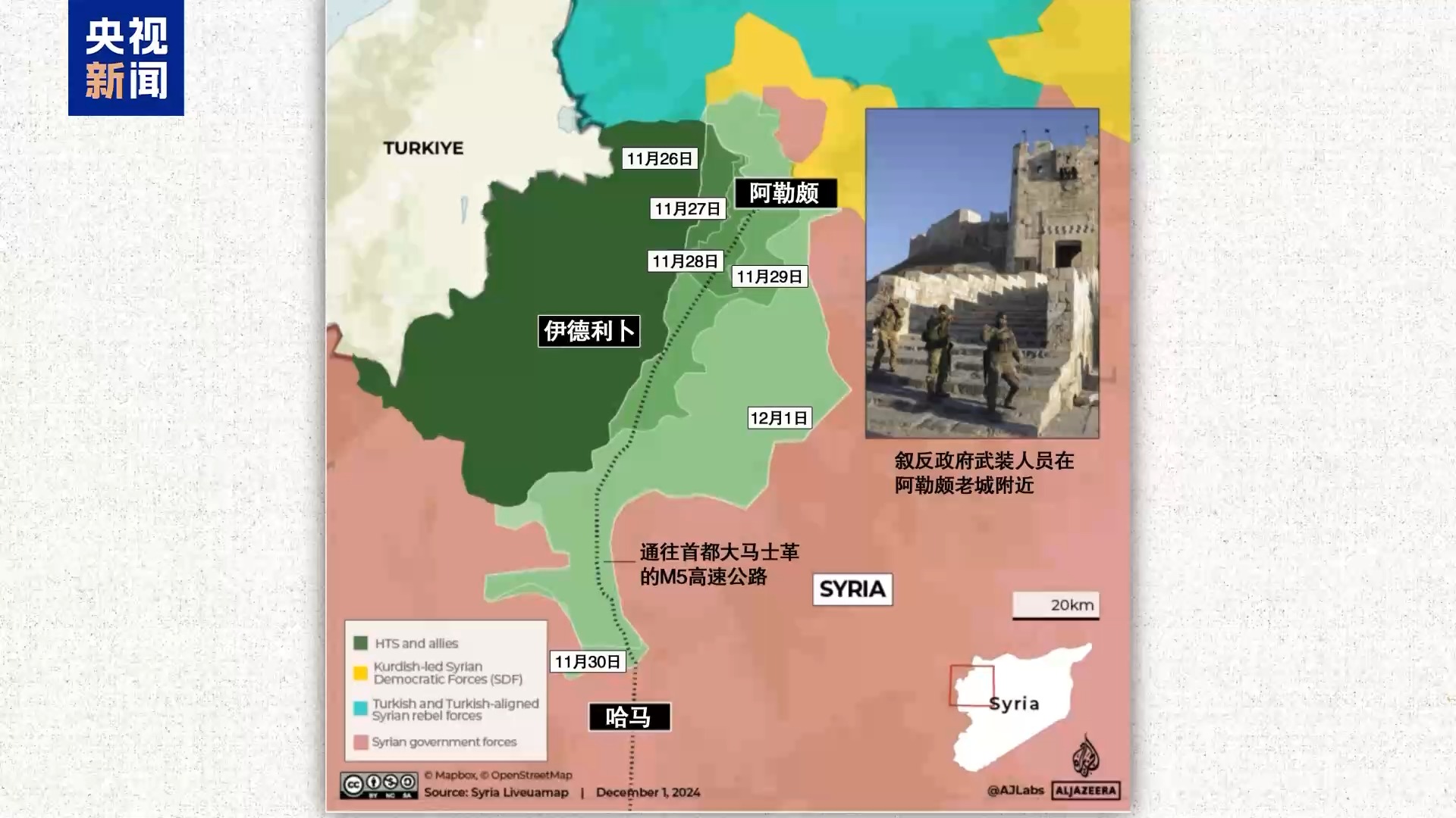 這張圖則標註了連日來敍利亞局勢驟然緊張的過程。自11月27日起,敍利亞政府軍與反政府武裝及極端組織持續在敍西北部地區發生大規模交火。11月30日,敍軍方稱反政府武裝已進入敍北部最大城市阿勒頗。當晚,雙方在敍中部哈馬省發生交火。敍軍方12月1日説,政府軍已加強在哈馬省北部的軍力部署,並已重新控制該地區一些城鎮。