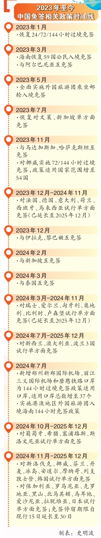 【環球時報綜合報道】編者的話:自去年年底至今,中方先後對38個國家實行免籤,目前累計同25個國家實現全面互免簽證。同時,通過優化簽證申請表、取消簽證預約、擴大免採指紋範圍、調減簽證規費等措施,來華簽證手續也變得更加高效便捷。隨着免籤政策的紅利持續釋放,來華旅遊已成為外國遊客的“流量密碼”,也是彰顯中國擴大高水平開放決心的“政策名片”。接受《環球時報》記者採訪的業內人士普遍觀察到,過去一年來,免籤政策給中國入境遊和中外民間交流帶來了從量到質的全方位提升。有業內人士預測,2025年,中國免籤政策的效果會得到更加可觀的顯現。