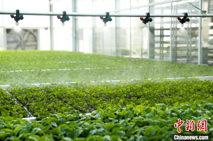 12月2日,浙江杭州謝徑安·傳化農創村的育種車間,噴灌系統在對育種苗圃澆水。中新社記者 張祥毅 攝