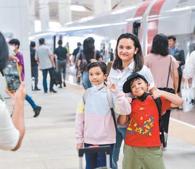 雅萬高鐵是我國在境外完成全過程勘察設計建設的首個高鐵項目,於去年10月17日正式開通運營,是中印尼共建“一帶一路”合作的典範。圖為乘客在和雅萬高鐵動車組合影留念。