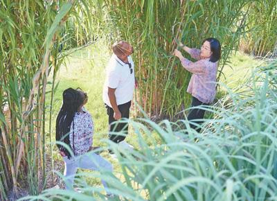 福建農林大學國際菌草工程技術研究中心工作人員(右)在向盧旺達留學生介紹菌草品種“綠洲1號”蘆竹的生長情況。