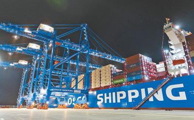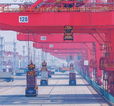 共建“一帶一路”國家在工作制度對接、技術標準協調、檢驗結果互認等方面強化合作、統一標準,貿易自由化便利化水平不斷提升。上海洋山港海關對接共建國家進出口貨物相關標準,推動通關一體化方式申報,提升通關效率。圖為無人駕駛的全自動導引車在洋山港穿梭往來,搬運集裝箱。