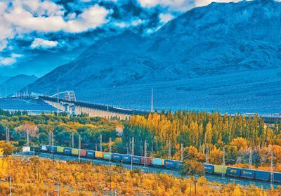 2013年,隨着共建“一帶一路”倡議提出,中歐班列應運而生。今年11月20日,第十萬列中歐班列正式出境。截至目前,中歐班列累計運送貨物超1100萬標箱、貨值超4200億美元,貨物品類達53大類5萬餘種。圖為中歐班列行駛在新疆烏魯木齊達坂城濕地。