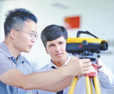 在塔吉克斯坦首都杜尚別的魯班工坊,來自天津城市建設管理職業技術學院的老師(左)為當地學生提供指導。