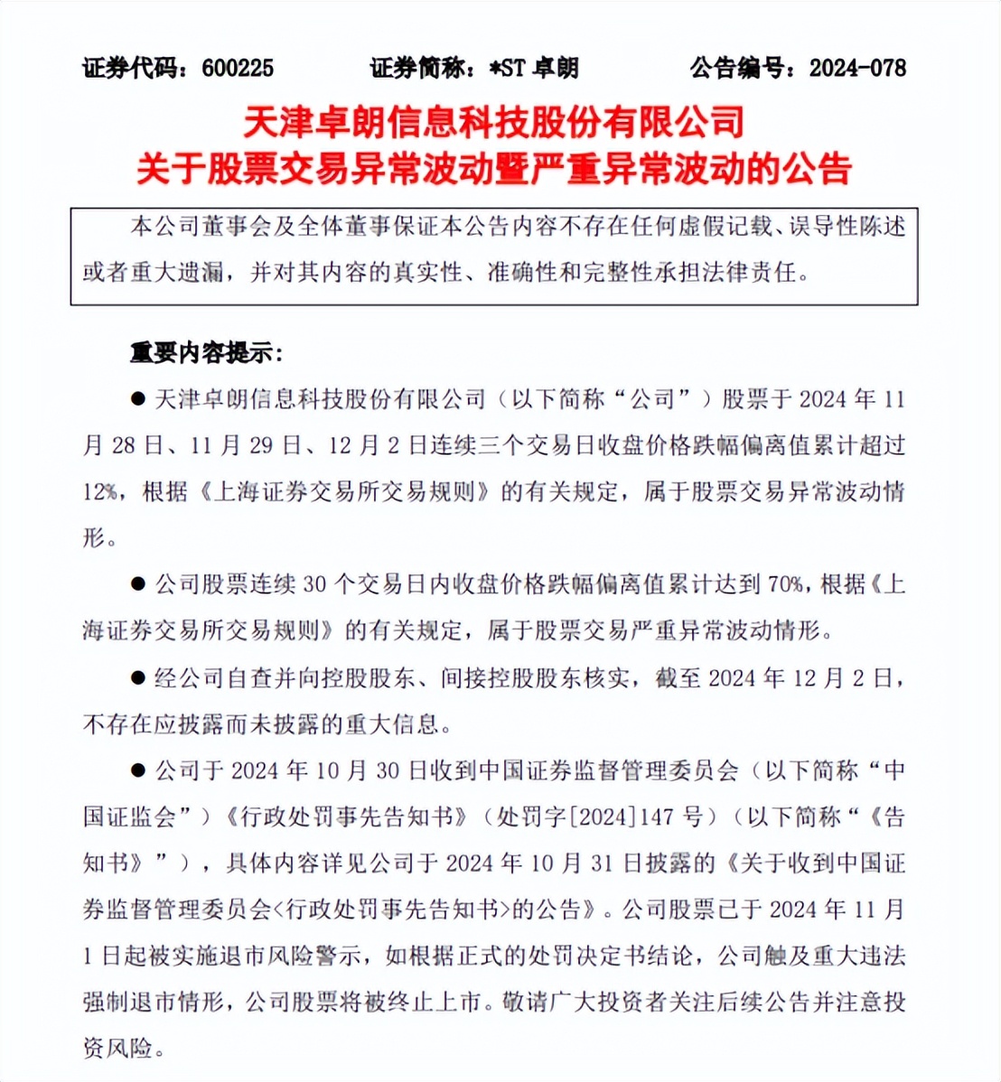 *ST卓朗因重大違法遭強制退市風險警示,股價大幅波動