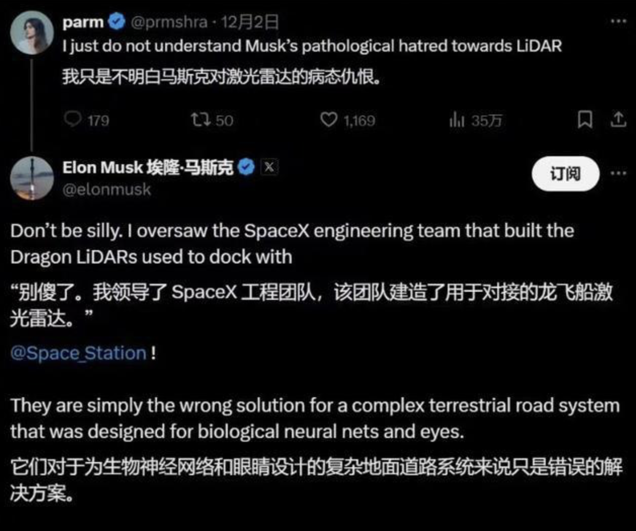 【環球網智駕綜合報道】12月3日消息,特斯拉CEO埃隆·馬斯克在社交軟件中回覆網友時,再次強調了特斯拉在自動駕駛領域的技術路線——堅持以純視覺為核心的感知系統。馬斯克批評激光雷達技術為“錯誤的解決方案”,並重申了其一貫的觀點:在複雜的道路駕駛環境中,模擬生物神經網絡和眼睛的視覺系統才是最為有效的方式。