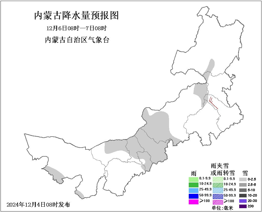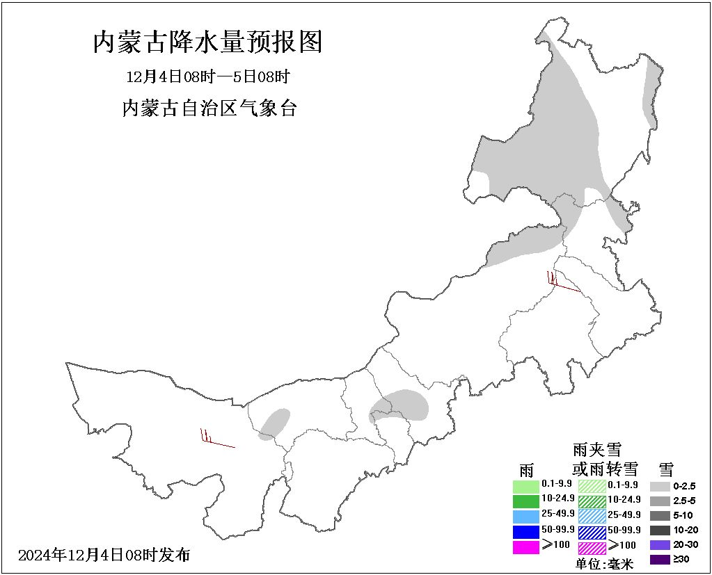 昨日,內蒙古降水主要出現在呼和浩特市、巴彥淖爾市、呼倫貝爾市。監測顯示,全區11個盟市26個旗縣的61個站點出現降水。1個旗縣1個站出現中雪,為呼和浩特市清水河縣韭菜莊2.5毫米。25個旗縣60個站出現小雪,其中,巴彥淖爾市烏拉特後旗獲各琦蘇木滿都拉2.3毫米,呼倫貝爾市牙克石市烏奴爾鎮興安嶺2.2毫米、烏奴爾2.1毫米。