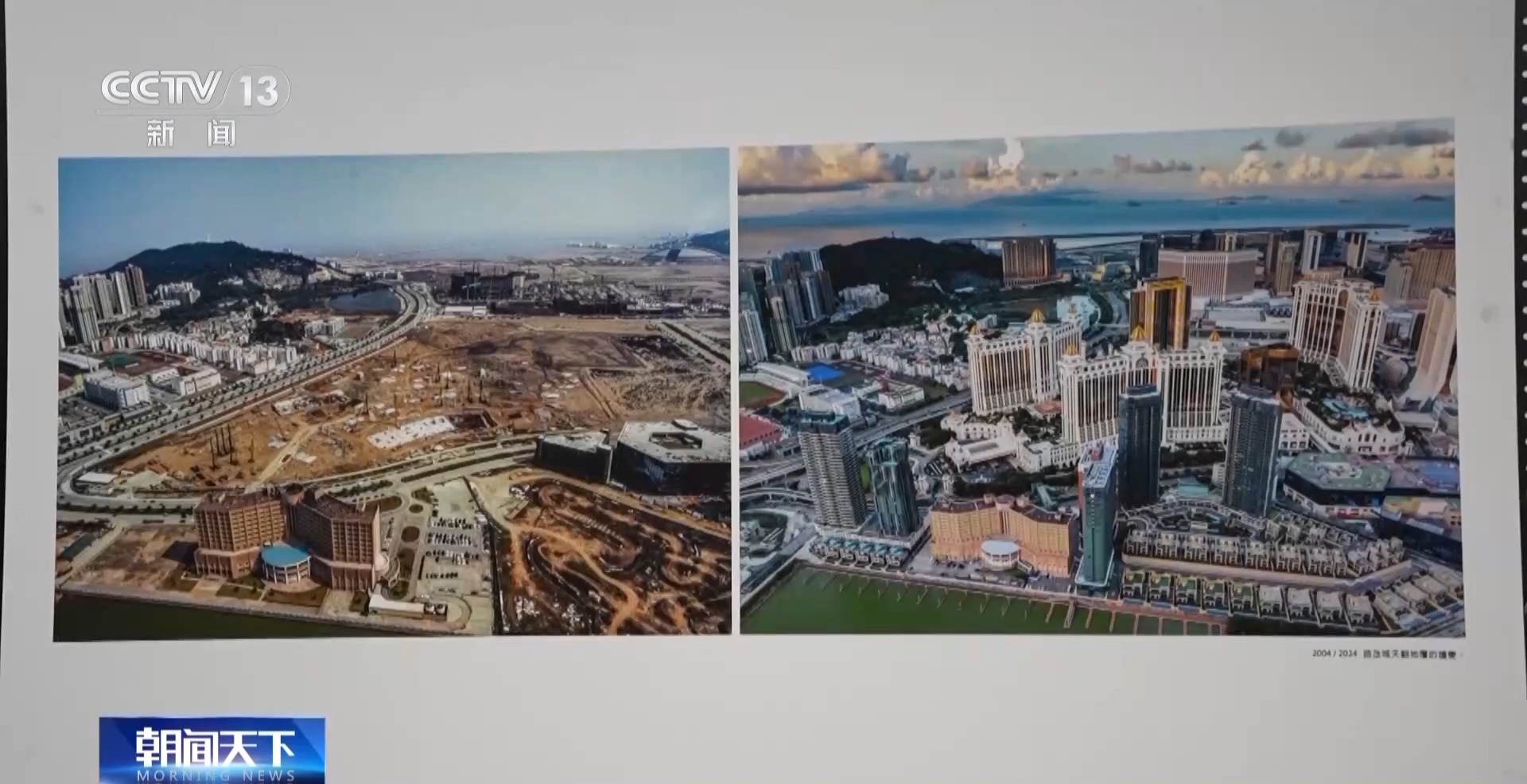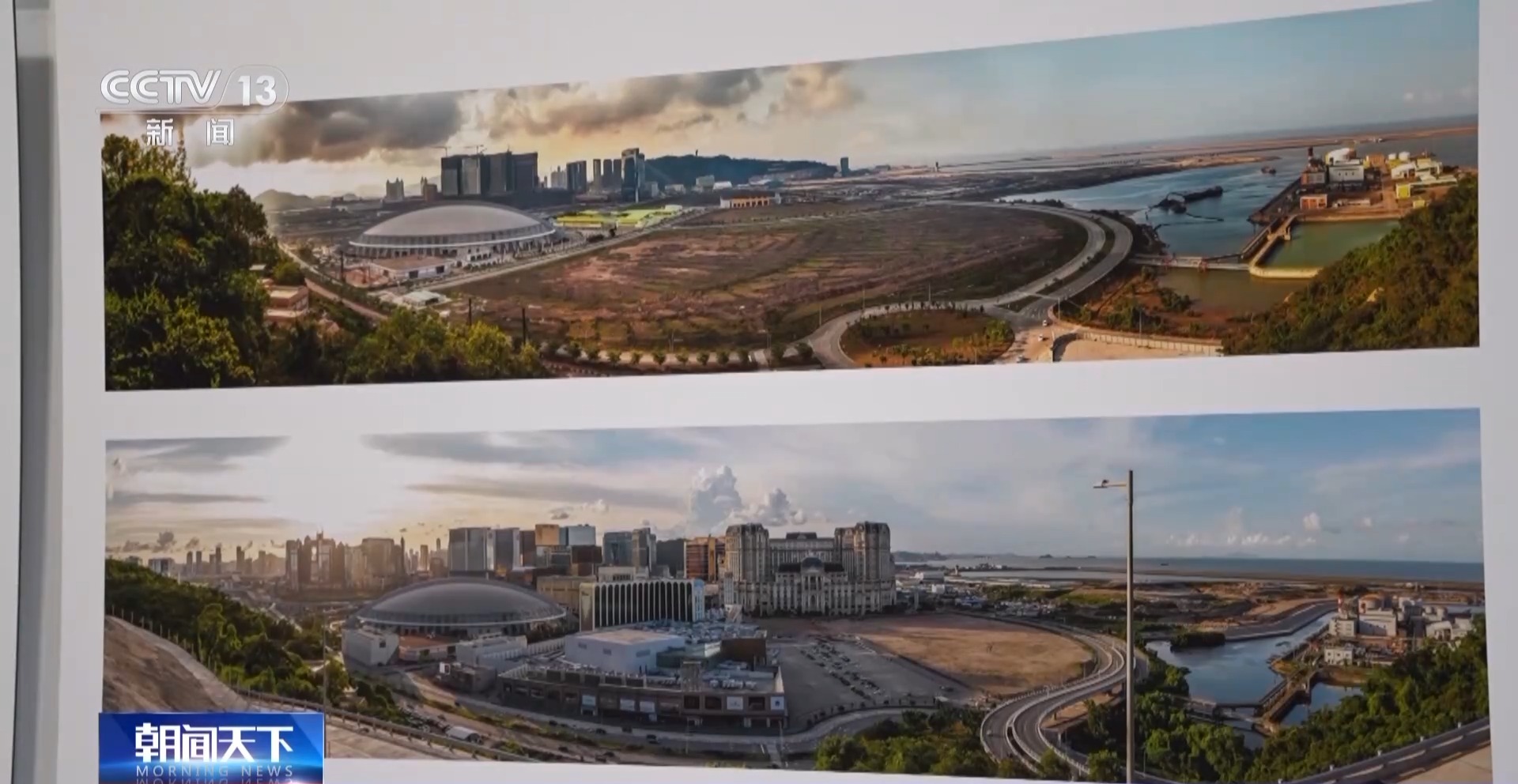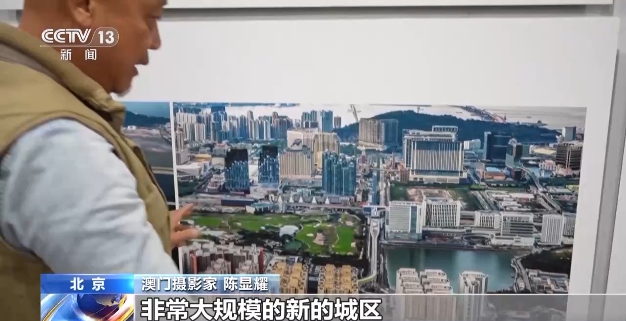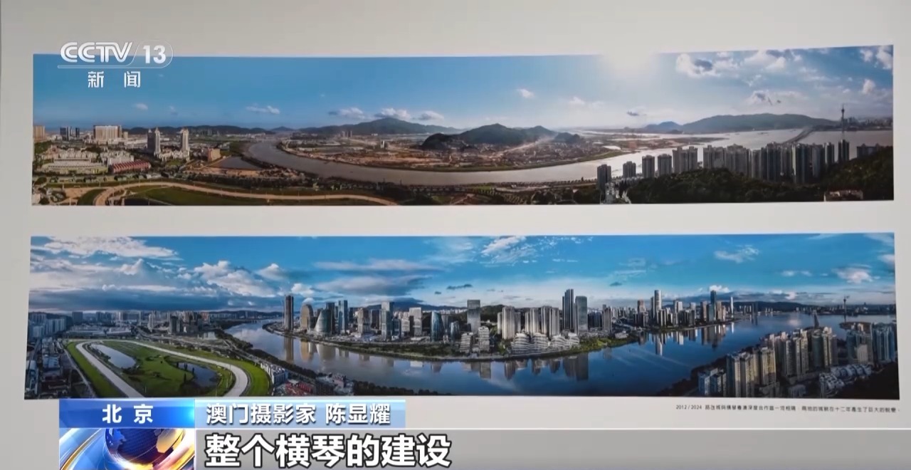 *澳門攝影家 陳顯耀:*迴歸之後,隨着我們澳門的發展,也是帶動周邊區域一起發展繁榮。我們畫面看到的是橫琴,上面的照片是2012年的時候,橫琴都是山體,在準備開發了。下面是成立的橫琴粵澳深度合作區,整個橫琴的建設也為我們澳門的發展建設提供了一個很重要的支撐、保障。