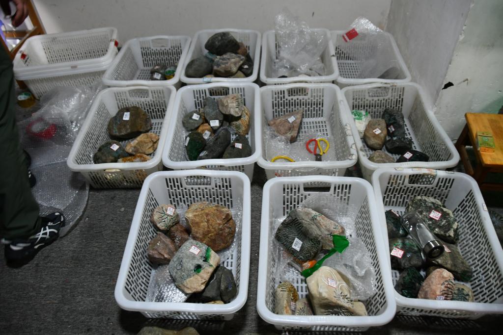 警方查獲直播間中銷售的翡翠原石。(謝月 攝)