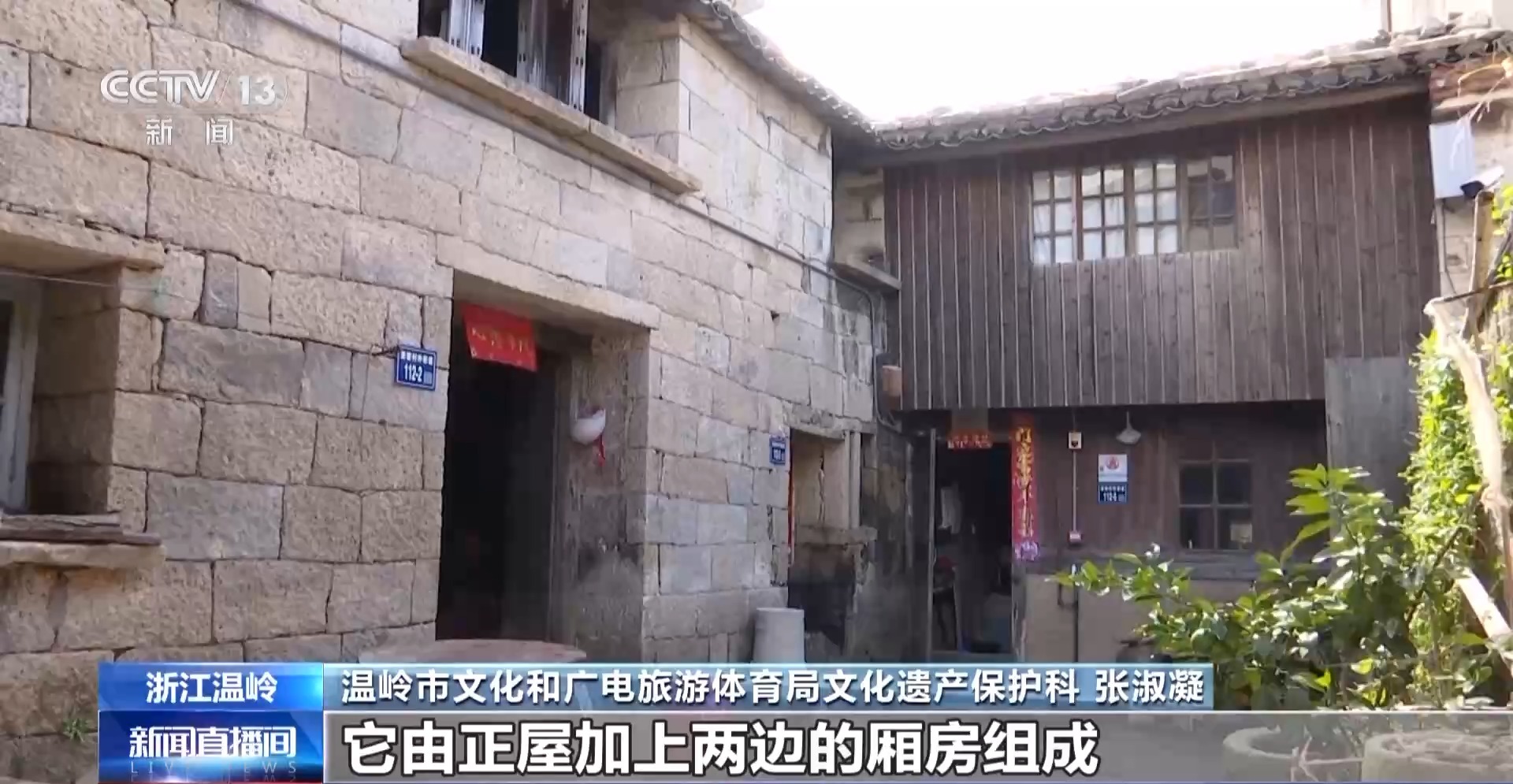 *温嶺市文化和廣電旅遊體育局文化遺產保護科 張淑凝:*這是一個典型的石屋裏面三合院的建築,由正屋加上兩邊的廂房組成。牆體是非常厚實的,外面很規整,很整潔漂亮。但是裏面那就另外一個場景,它是填充的不規則的亂石,然後用糯米灰漿蠣灰把它給粘起來,條件好的家庭呢,會對內牆進行粉刷。