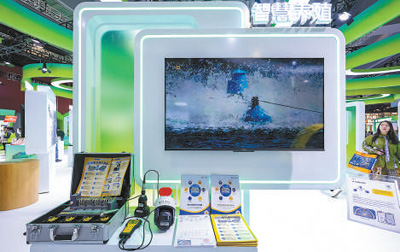 中國電信展台前,工作人員向客商介紹保障農產品質量安全的區塊鏈技術。