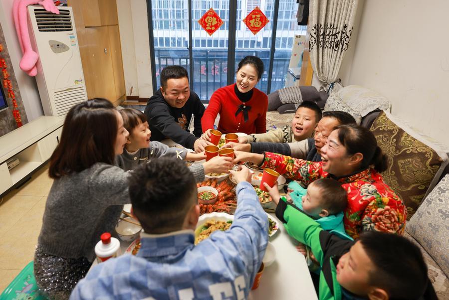 2024年2月9日,貴州省遵義市正安縣一户居民在家中吃年夜飯。 新華社發(趙永章 攝)