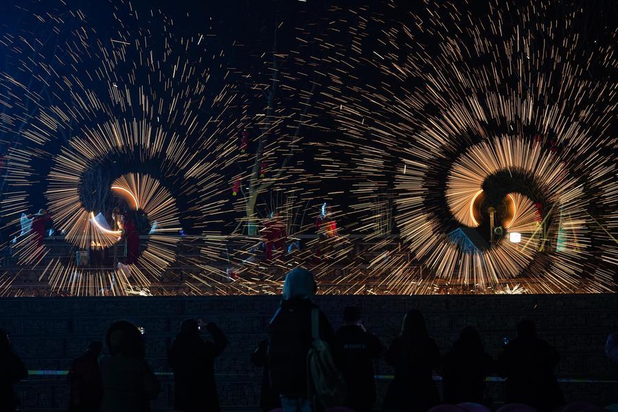 2023年1月23日,觀眾在江蘇盱眙第一山歷史文化街區觀看打鐵花表演。 新華社記者 季春鵬 攝