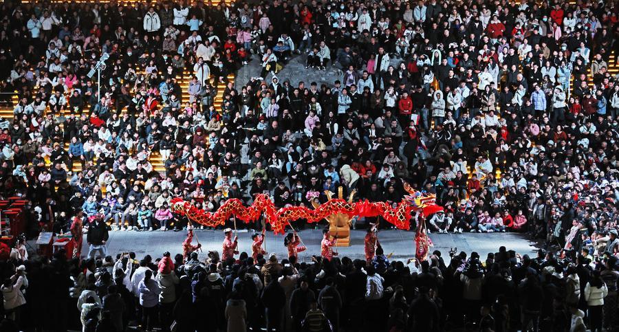 2024年2月12日,遊客在山東省臨沂市郯城縣郯國古城景區觀看舞龍表演。 新華社發(張春雷 攝)