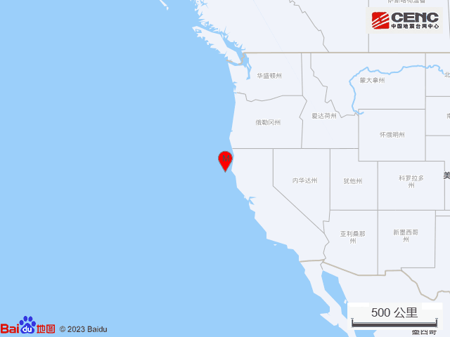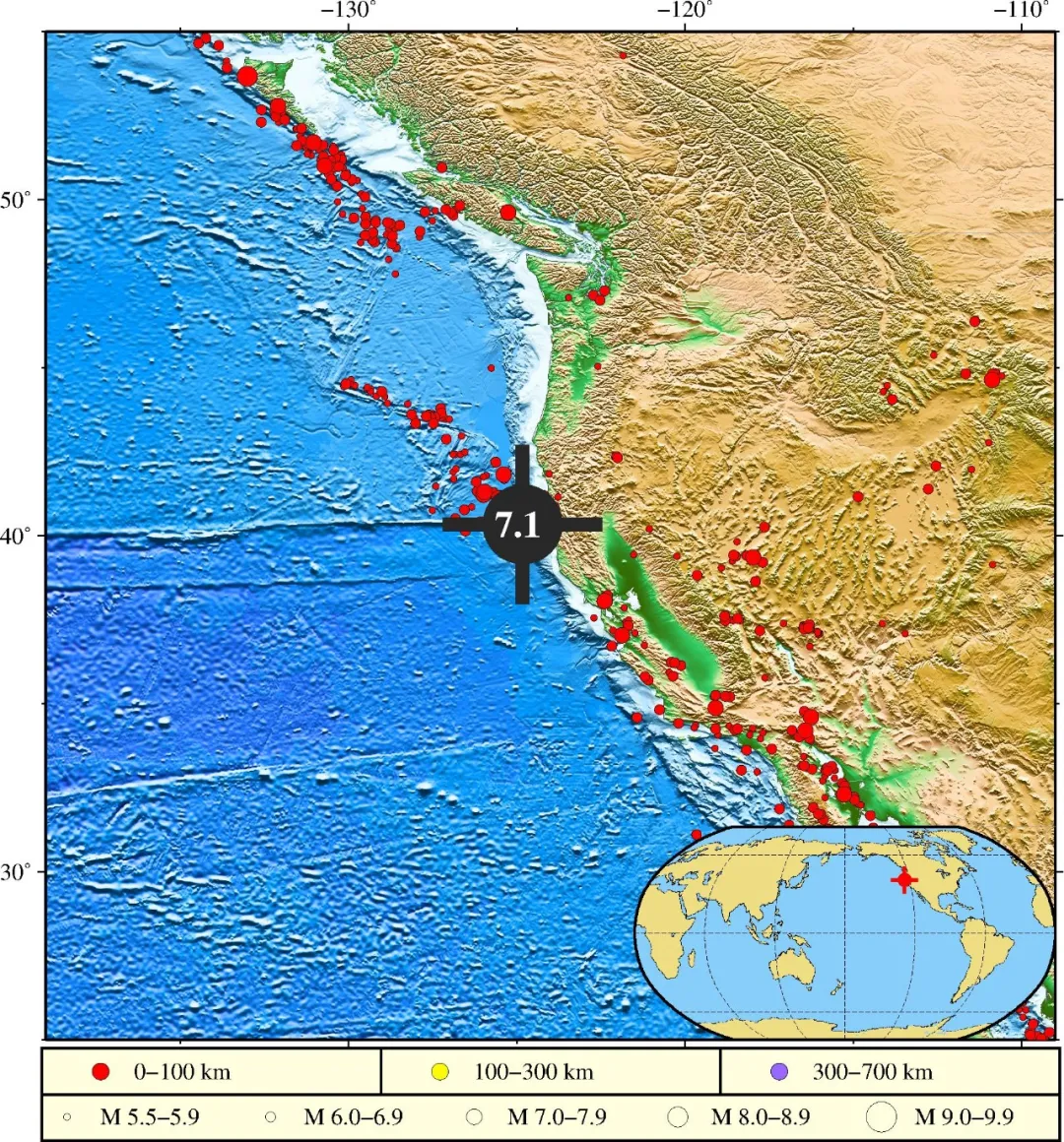 中國地震台網正式測定,北京時間12月6日2時44分(當地時間12月5日10時44分)在美國加利福尼亞州北部沿岸近海發生7.0級地震,震源深度10公里,震中位於北緯40.40度,西經125.00度。