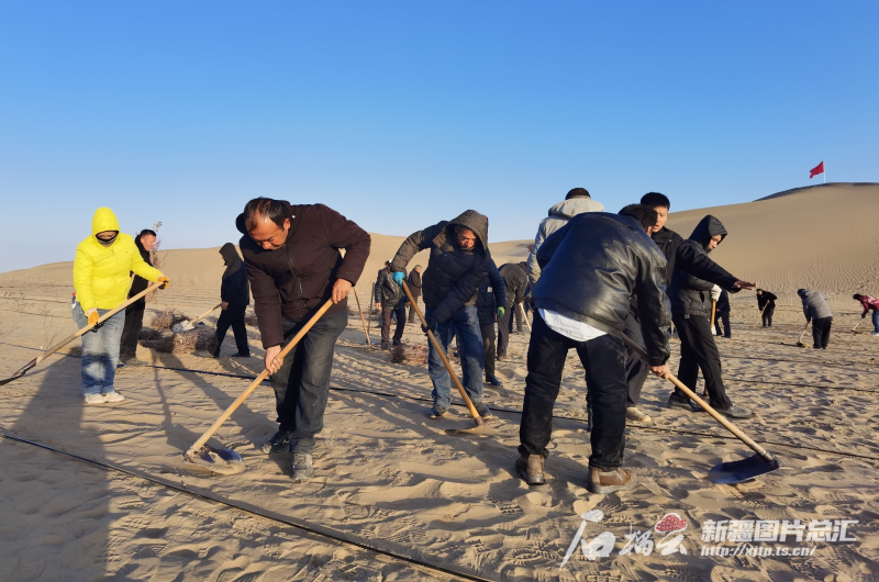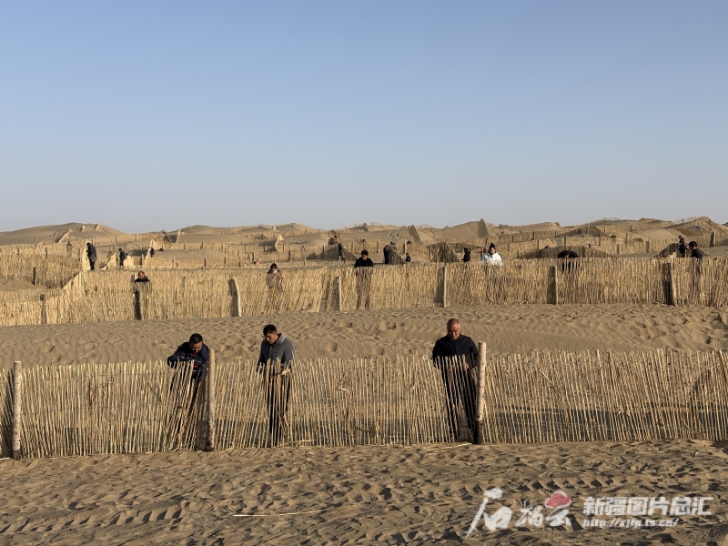 11月27日,皮山縣科克鐵熱克鎮至葉城方向沙漠“鎖邊”任務現場,羣眾正在搭建高立式沙障。阿卜力克木·依卜拉音攝