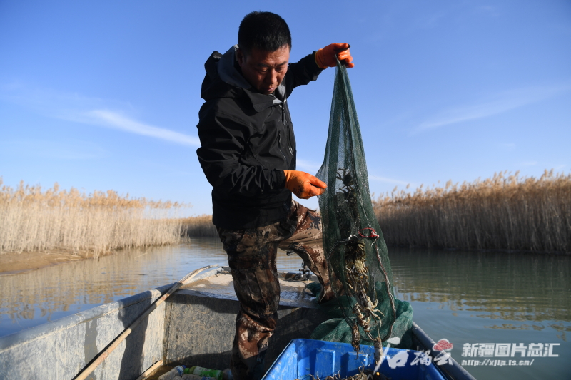 11月30日,在策勒縣沙漠玉湖上,養殖人員正在捕撈螃蟹。石榴雲/新疆日報記者 拍熱扎提·阿不都攝