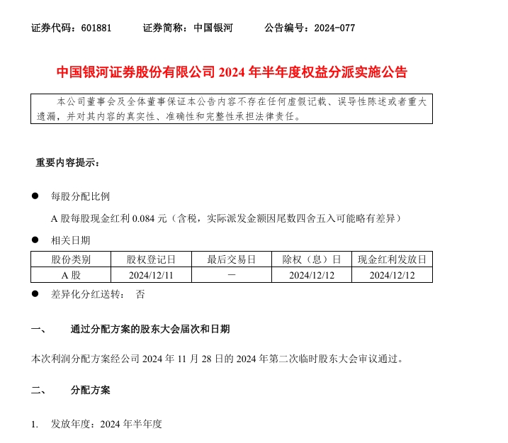 此外,本次利潤分配方案經中國銀河11月28日的2024年第二次臨時股東大會審議通過。且利潤分配以方案實施前的公司總股本10,934,402,256 股為基數,共計派發現金紅利 918,489,789.50 元(含税)。