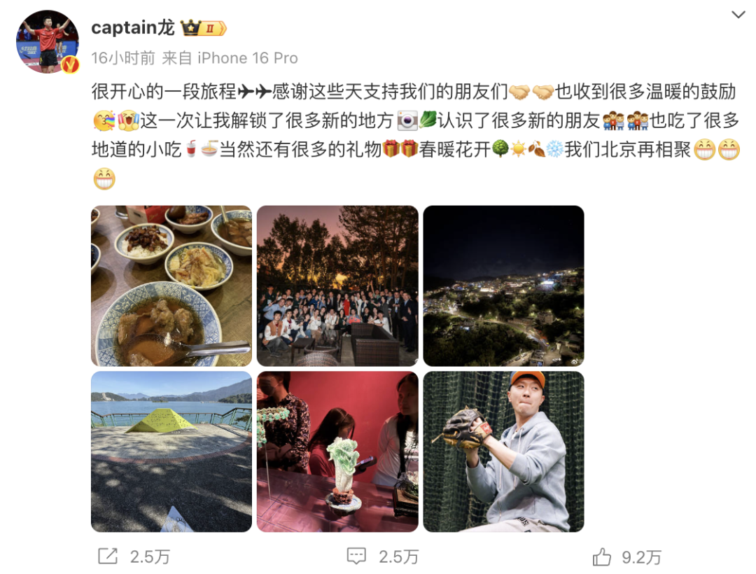 馬龍在社交媒體發文告別台灣行: