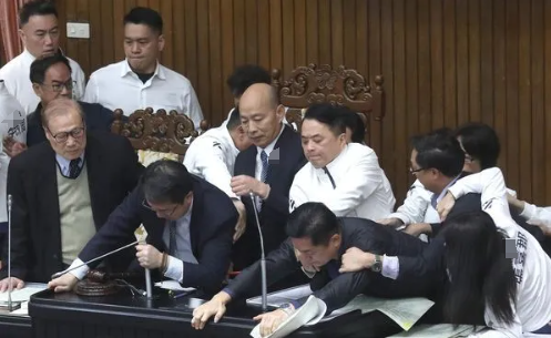 台灣東森新聞雲報道稱,台立法機構今日(6日)召開會議,國民黨黨團提出變更議程,將“選罷法”加嚴版本排入今日討論事項第一案,希望今日可以二三讀。不過,處理變更議程時,數位民進黨民意代表看準時機,由賴瑞隆、邱志偉帶頭,從主席台後方大門闖入,直接佔領主席台,藍綠民意代表隨即皆往主席台上衝並互嗆。因場面混亂,立法機構負責人韓國瑜宣佈休息10分鐘。