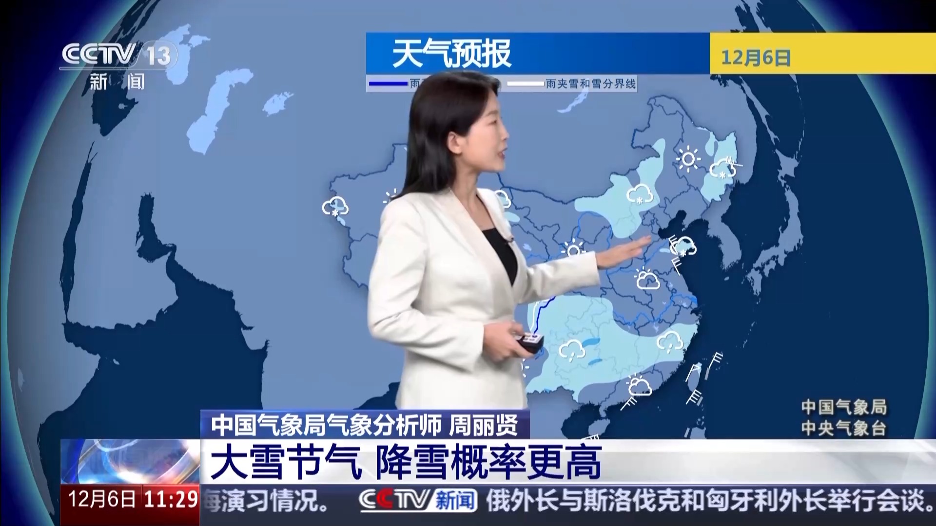 *中國氣象局氣象分析師 周麗賢:*今天迎來大雪節氣,氣候上從小雪到大雪時節,我們國家的平均降水量是進一步減少的。説明大雪指的並不是雪下得更大了,而是降雪的概率更大,降雪的日數增多。以南京還有鄭州為例,都是小雪節氣的平均降水量更多。而在大雪期間,雪日更多,那説明在大雪期間降雪更加的頻繁,那不光是這兩個城市,從東北一直到長江中下游的不少城市都是在大雪期間降雪更加的頻繁,那特別是武漢和南京,降雪的概率更是翻了4倍。