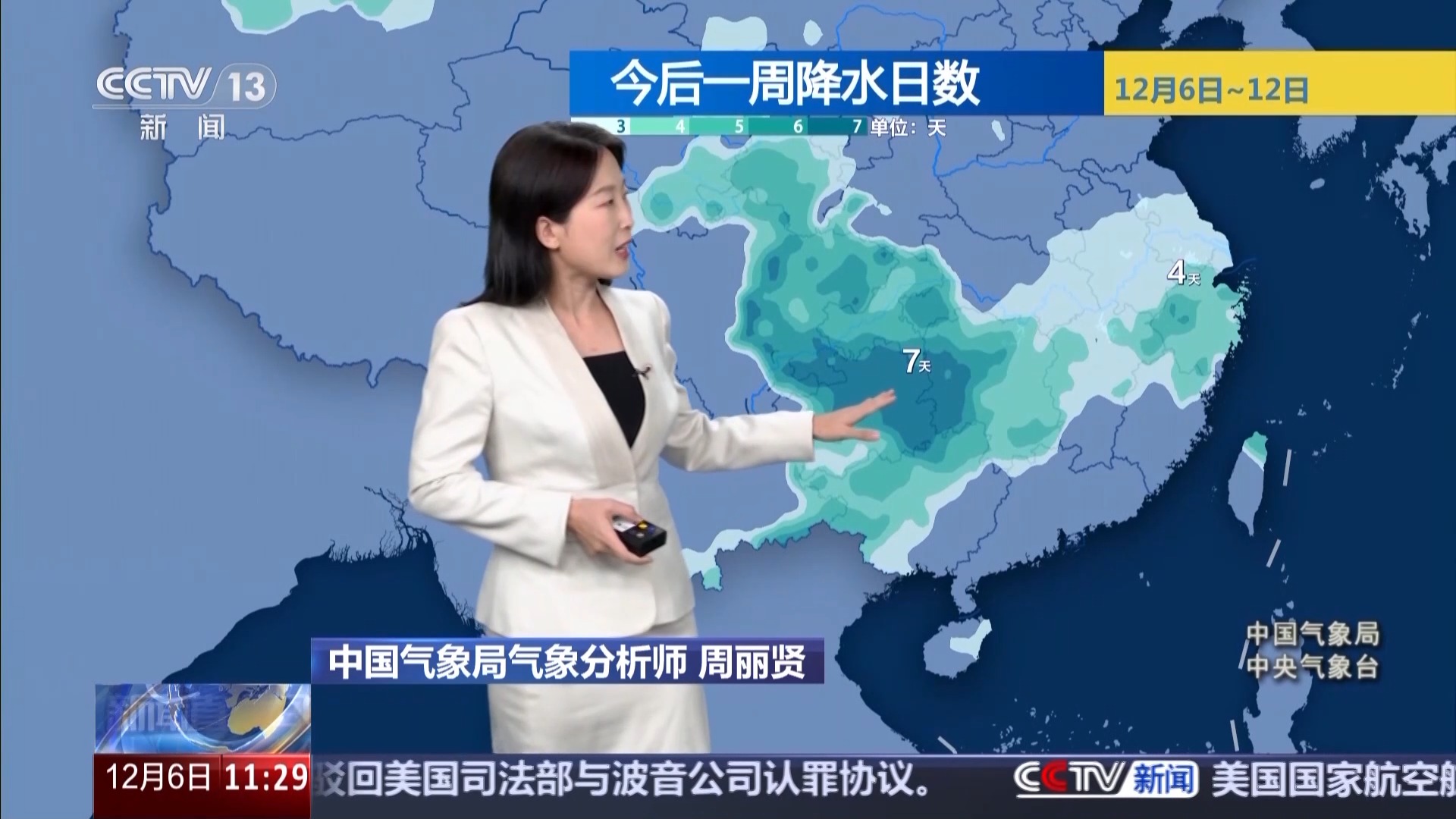*中國氣象局氣象分析師 周麗賢:*常年來看,大雪期間,雪花是可以飄到江南一帶的。然而今年,大雪期間江南這一帶只有雨沒有雪。我們預計在今後七天裏,長江流域這一片區域,是以陰雨多陰雨的天氣格局為主,在七天當中,大概有五六天是非陰即雨的狀態,預計在8日的時候,南方將會迎來一個降雨的暫停,但是想要大面積地放晴,預計會要等到13日,也就是下週五的時候。