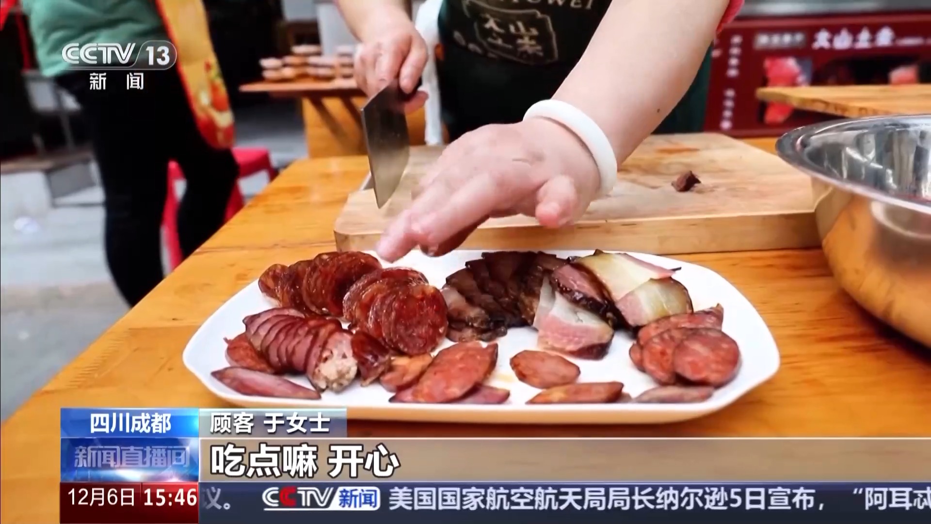 *總枱記者 趙雄:*我現在是在成都青羊區的新開寺街,這條街也被當地人譽為香腸一條街。入冬以來,這裏的人氣可以説是越來越旺。我們在現場看到,很多商家也是掛滿了香腸和臘肉,不少羣眾還有顧客也是圍到了餐桌前,開始品嚐各種不同的臘味。