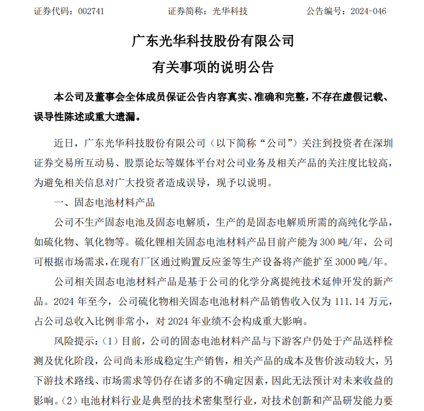 【環球網能源綜合報道】12月6日晚間,百億市值的光華科技發佈《有關事項的説明公告》,正式回應了近期市場對公司固態電池業務的廣泛關注。儘管公司股價因固態電池概念而持續上漲,但公告顯示,光華科技並不直接生產固態電池及固態電解質,而是專注於生產固態電解質所需的高純化學品。