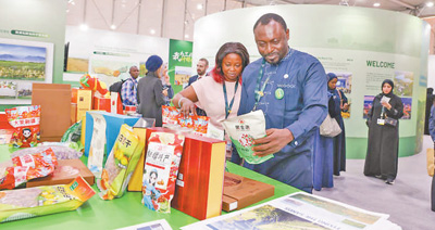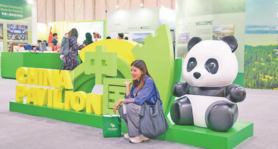 現場嘉賓瞭解中國館展出的中國特色林業產品。