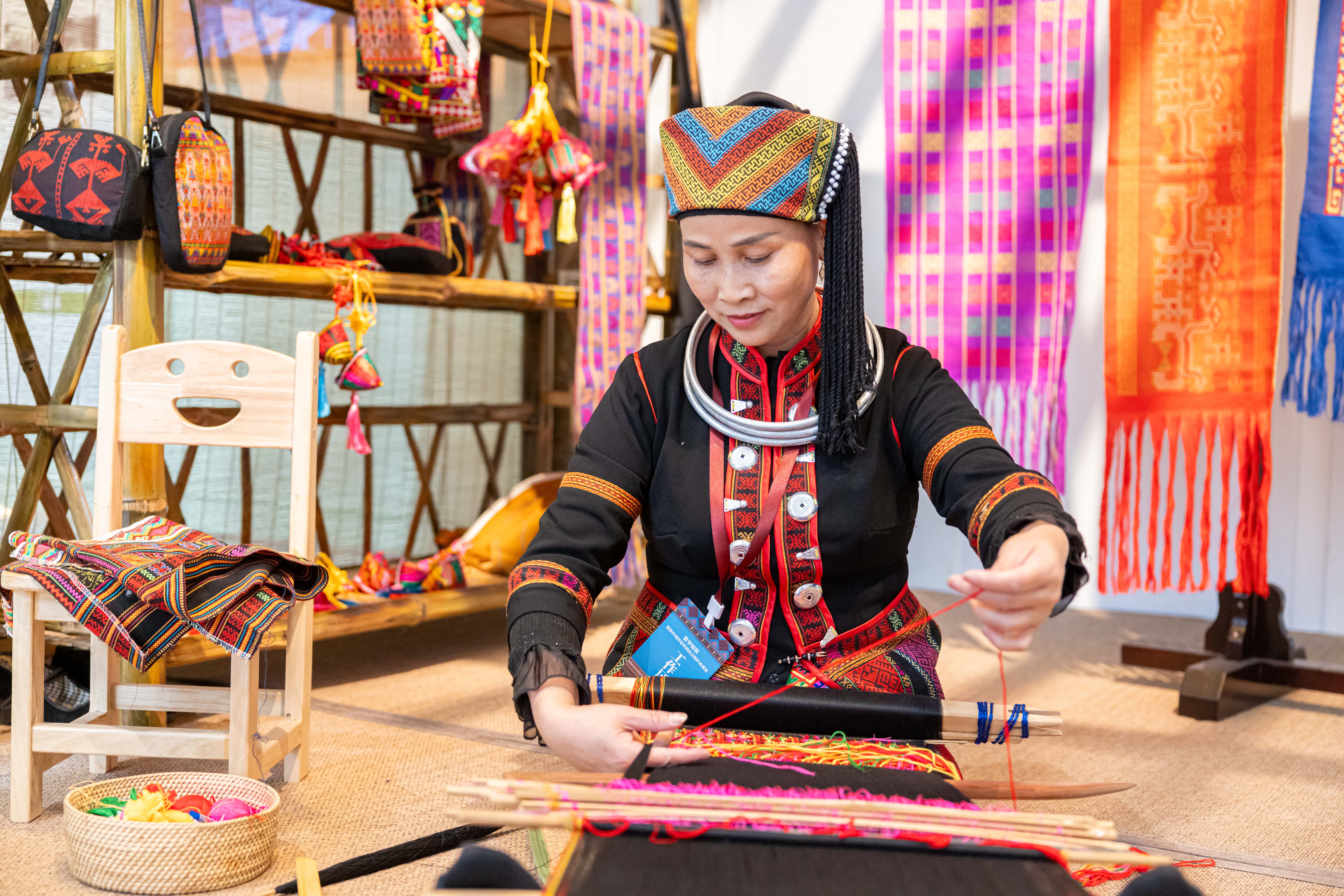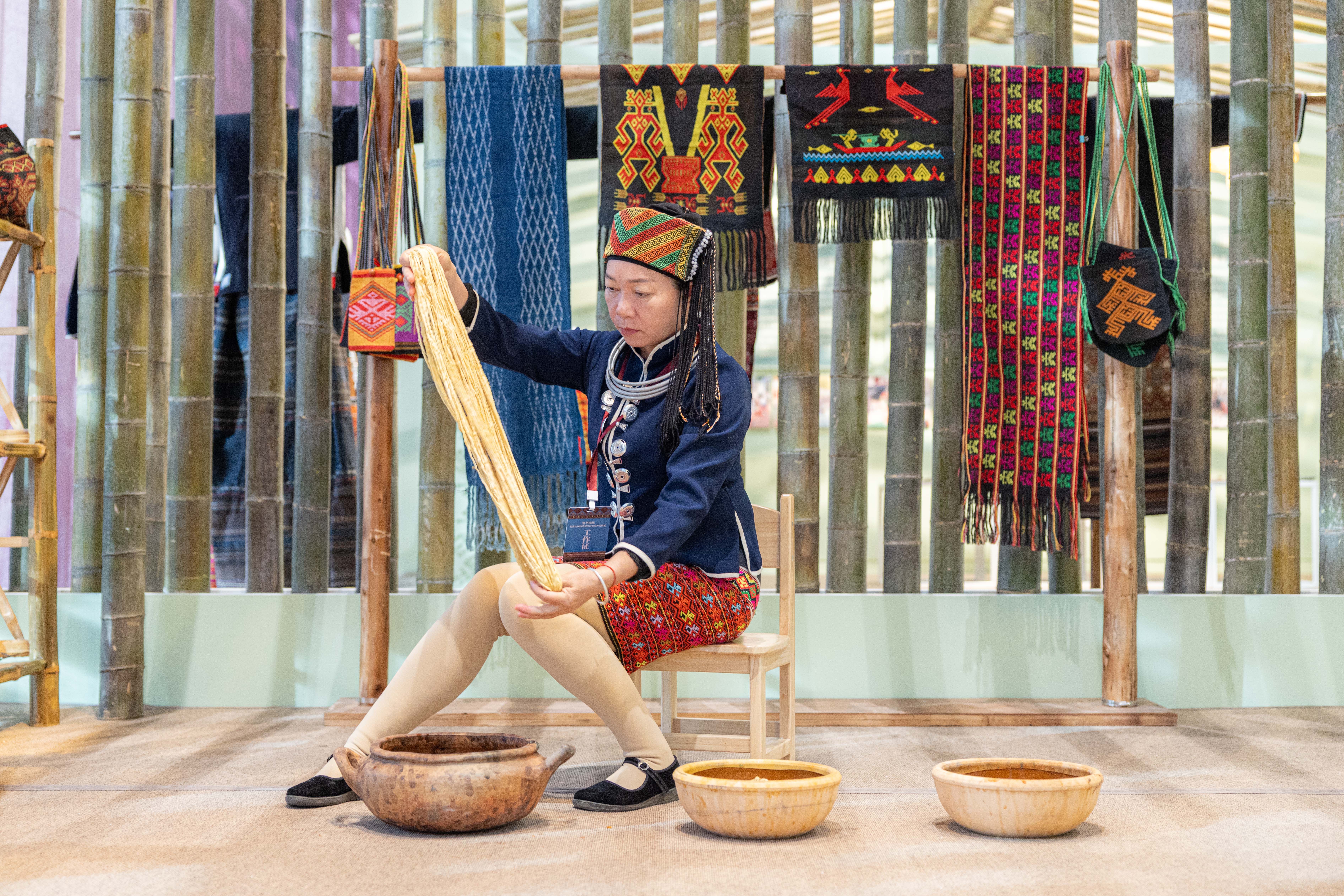 黎族傳統紡染織繡技藝傳承人在展覽現場展示技藝。省旅遊和文化廣電體育廳供圖