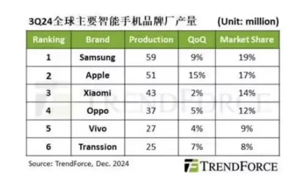 【環球網科技綜合報道】12月8日消息,根據市場研究機構TrendForce集邦諮詢發佈的調查報告,2024年第三季度智能手機市場迎來了銷售旺季,各大品牌紛紛推出旗艦新機,有效帶動了智能手機生產總數的增長。數據顯示,該季度智能手機生產總數環比增長了7%,達到了約3.1億部,與去年同期持平。