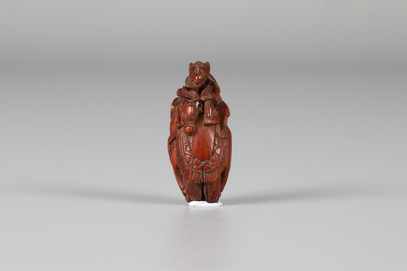 《馬上封侯》是明清工藝品中的常見題材,巧妙運用“猴”與“侯”諧音,寓意功名立至,即刻封侯。猴子手執官印,象徵權力與地位;蓮蓬象徵家庭和睦,幸福美滿;馬鞍上淺刻蘭花,預示清雅與高潔。整體造型設計感極強,藴含着對佩戴者的美好祝願,是“馬上封侯”類核雕文物中的珍品。