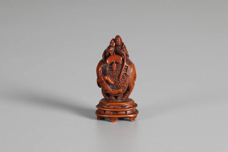 《同慶吉祥》是清中期核雕藝術的傑出代表,以童子騎象的場景為主題,巧妙地將吉祥的寓意與精湛的雕工施諸其上。兩位童子形象活潑,頭戴軟帽,微微前仰,左側童子一手持罄,另一手摟着右側童子的後背;右側童子手持戟,兩者姿態親暱,笑容可掬;大象作為吉祥和智慧的象徵,身馱華麗的毯墊,承載着童子。“童”“磬”“戟”“象”合為“同慶吉祥”的美好祝福,整體雕刻手法細膩,線條流暢,象背上毯墊的花邊和圖騰都被細緻刻畫,展現了清代核雕藝術的高超技藝。