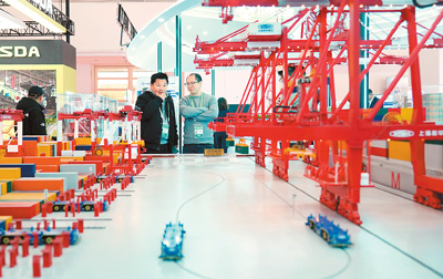 11月27日,在第二屆鏈博會先進製造鏈展區,人們在中交集團展台參觀上海洋山四期自動化碼頭模型。