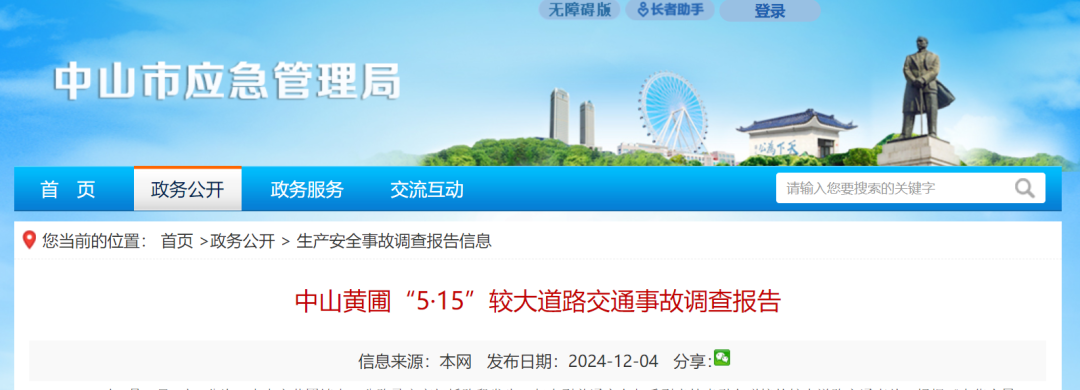日前,中山市應急管理局網站公佈了《中山黃圃“5·15”較大道路交通事故調查報告》。調查認定,中山市黃圃鎮“5·15”較大道路交通事故是一起生產安全責任事故。