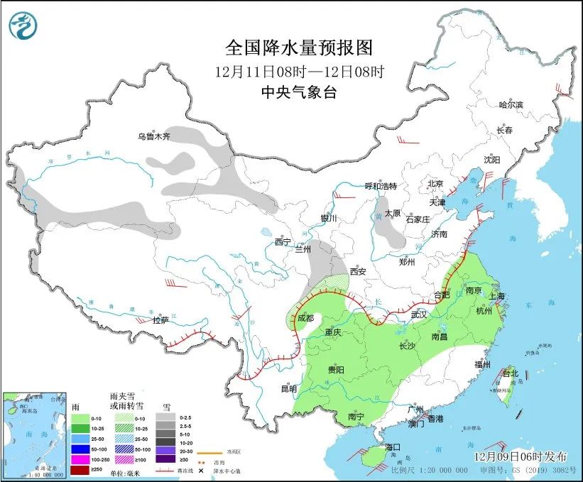 12月10日至11日,新疆北部、西藏東部、西北地區中東部、山西南部、河南西部、安徽北部、江蘇西北部、黑龍江中東部等地部分地區有小到中雪或雨夾雪。其中,西藏東部局地有大雪(5至9毫米)。西藏東南部、黃淮南部、江淮大部、江漢、江南北部和西部、西南地區東部、廣西西部、台灣島東部等地部分地區有小到中雨。西藏南部、內蒙古中部、遼東半島、山東半島、浙江東部沿海等地部分地區有4至6級風。