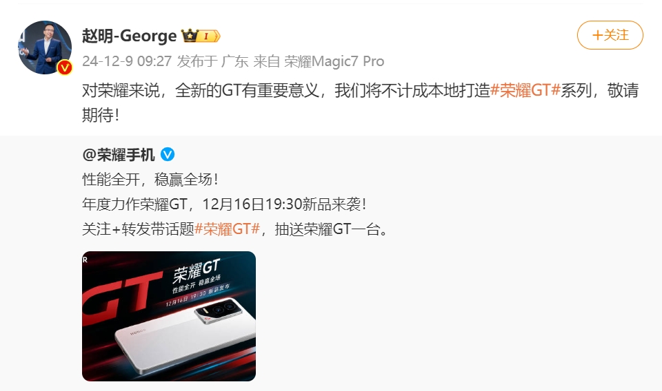 榮耀CEO趙明於社交平台表示,“對榮耀來説,全新的GT有重要意義,我們將不計成本地打造榮耀GT系列。”