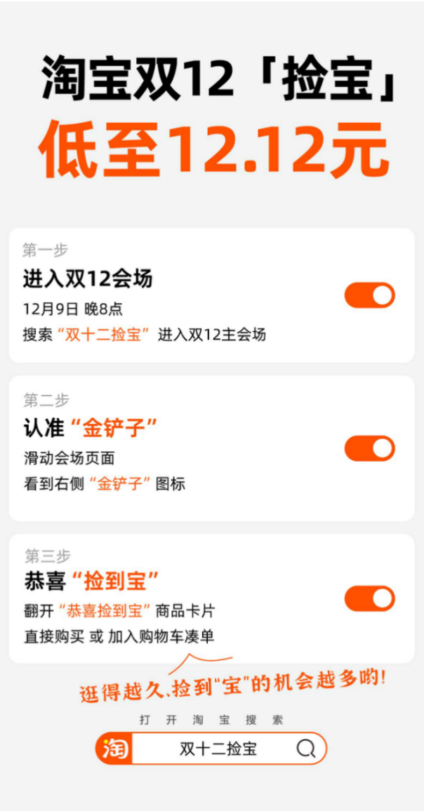 另外,這次的撿寶行動還增加了特別直播會場,從12月9日晚6點開始,淘寶官方直播間手把手教你撿漏雙12。