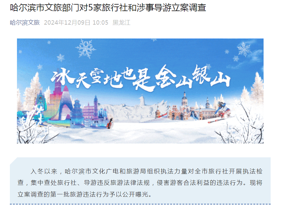 據“哈爾濱文旅”微信公眾號消息,入冬以來,哈爾濱市文化廣電和旅遊局組織執法力量對全市旅行社開展執法檢查,集中查處旅行社、導遊違反旅遊法律法規,侵害遊客合法利益的違法行為。現將立案調查的第一批旅遊違法行為予以公開曝光。