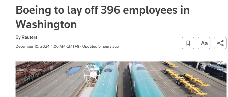 外媒:波音公司宣佈在華盛頓州裁員396人,為更廣泛裁員計劃一部分