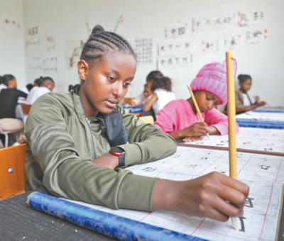在厄立特里亞高等教育與研究院孔子學院,當地學生正在練習中國書法。本報記者 沈小曉攝