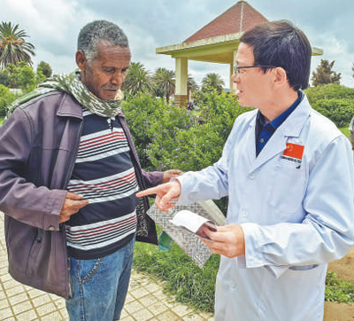 在厄立特里亞奧羅特醫院,中國第十七批援厄醫療隊隊長韓東明與一名當地患者進行交流。本報記者 任 彥攝