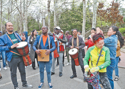 第七屆中非青年大聯歡期間,非洲青年代表與當地社區文藝隊成員在山東青島八大關街道互動。本報記者 陳尚文攝