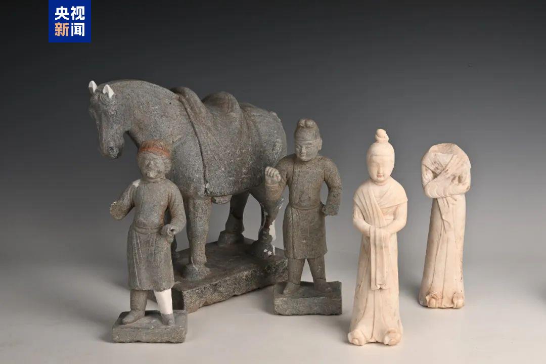 另外,考古人員還發現唐代“安定烏支族”梁氏家族墓地,由三座帶天井斜坡墓道磚室墓組成,呈品字形分佈,出土青石馬、青石俑、漢白玉俑等石制陪葬品,青石俑形象為胡人牽馬,漢白玉俑為女性立姿,朱唇裝飾。其中一件赤發朱唇白玉石俑,初步推測其為黠戛斯人,與乾陵石人像左威衞大將軍兼堅昆都督結匐膚莫賀咄為同族,這一完整黠戛斯人人物形象的發現,尚屬首次。