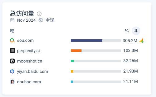結合經 Google Analytics 校準後的 Similarweb 平台數據,360AI搜索月訪問量已超3億,遠超第2名到第20名訪問量總和,輕鬆衞冕“AI產品榜·國內總榜”第一名。