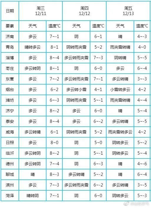 最低氣温:魯中山區*-5℃* 左右,其他地區*-3℃* 左右。