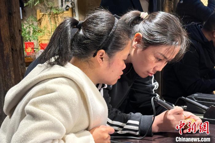 王小榮(右)在教遊客葫蘆烙畫。錢晨菲 攝