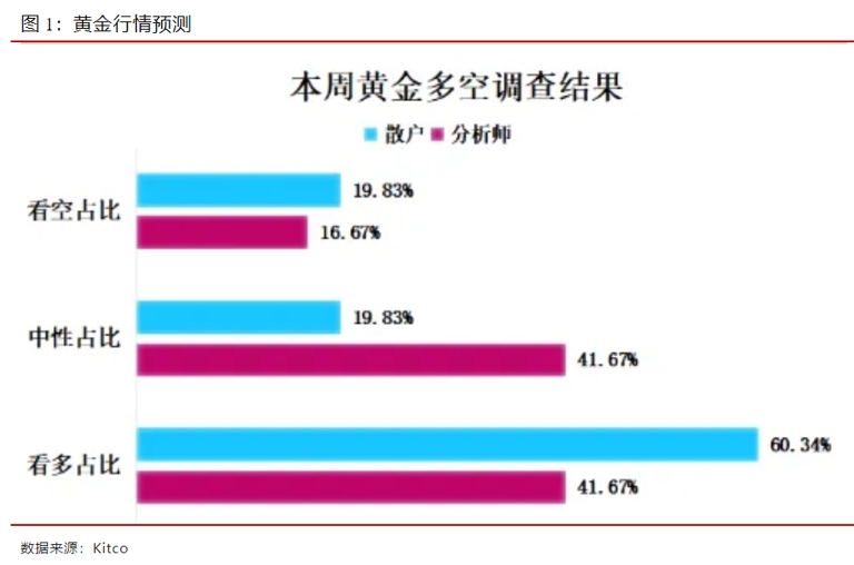 大陸期貨還提到,上週在Kitco News的周度黃金調查中,12位分析師參與了投票,其中5位(佔比42%)預計黃金價格將在下週上漲,另外5位(同樣佔比42%)預測黃金將繼續盤整,剩餘的2位(佔比17%)預計價格將下跌。在線調查中,116名散户交易者參與投票,其中70位(佔比60%)看多,23位(佔比20%)看空,剩餘的23位(佔比20%)預計黃金將繼續橫盤整理。