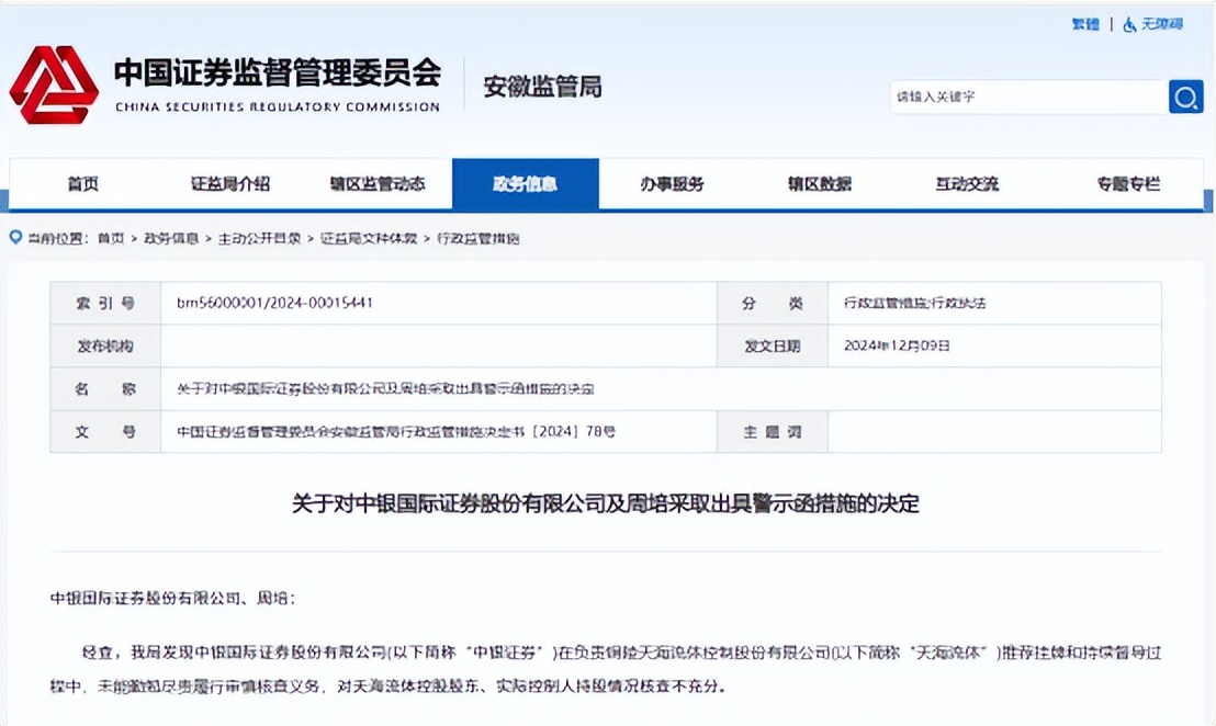 【環球網財經綜合報道】12月10日,安徽證監局發佈公告,對中銀國際證券股份有限公司(以下簡稱中銀證券)及其項目負責人周培採取出具警示函的行政監管措施,並記入證券期貨誠信檔案。這一處罰源於中銀證券在負責銅陵天海流體控制股份有限公司(以下簡稱天海流體)推薦掛牌和持續督導過程中,未能勤勉盡責履行審慎核查義務,對天海流體控股股東、實際控制人持股情況核查不充分。