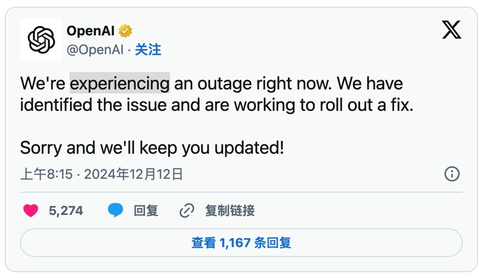 “我們收到報告稱,API 調用返回錯誤,並且登錄時遇到困難。我們已經確定了問題所在,正在努力推出修復方案。我們正在儘快恢復正常服務,並對停機時間表示歉意,”一位 OpenAI 工程師在社交媒體上分享道。(勃潺)